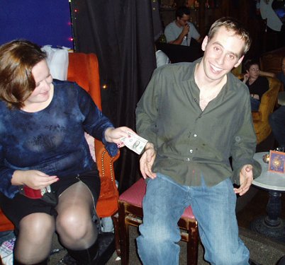 Evan's motto: Will strip for money. (It sure beats dancing! Wait... strippers dance too! Crap!) Munchaba Lounge, Levittown, Long Island, 8/21/04